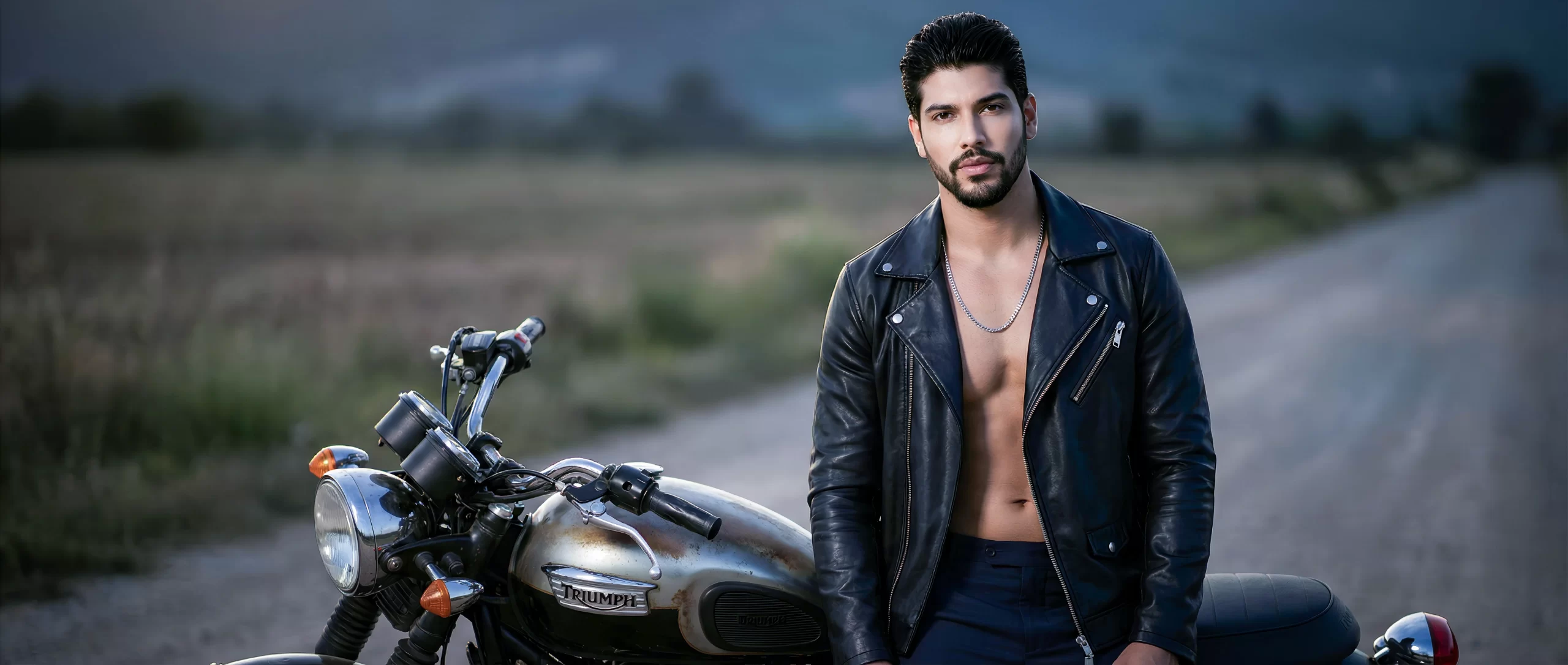 JoeRay editorial fashion model wearing luxury casual menswear, seated on a Harley-Davidson motorcycle inside a high-end fashion boutique, expressing masculine elegance and modern lifestyle